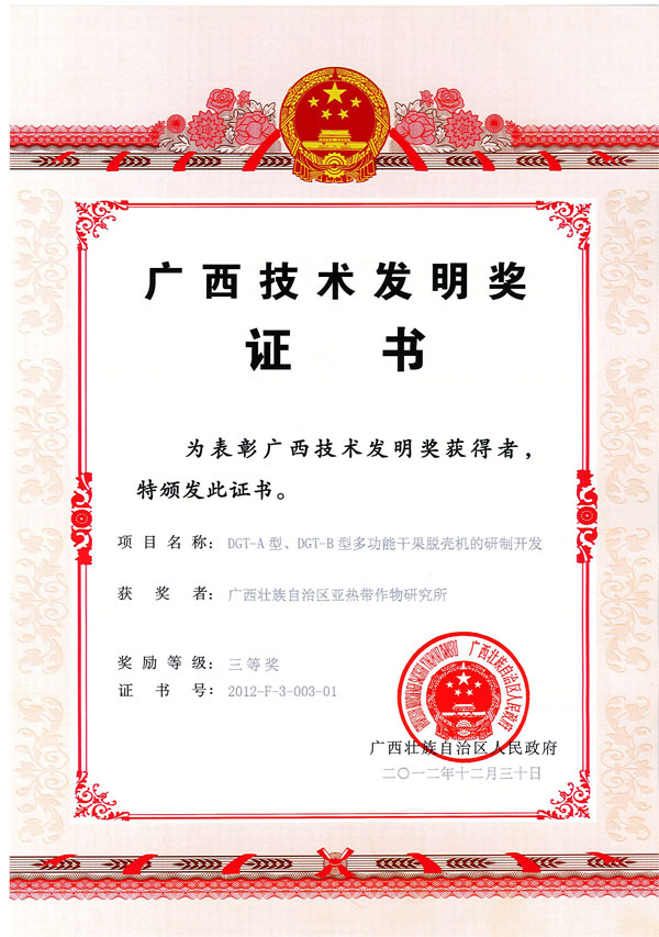 2012 | DGT—A型、DGT—B型多功能干果脱壳机的研制开发 | 广西技术发明奖三等奖、广西农垦技术发明奖二等奖 | 广西壮族自治区亚热带作物研究所 | 陈显国、杨万达、林玉虹、曾黎明、叶雪英、崔明勇、陈涛、刘功德、蔡元保、冯春梅、张武贵、罗日梅 |