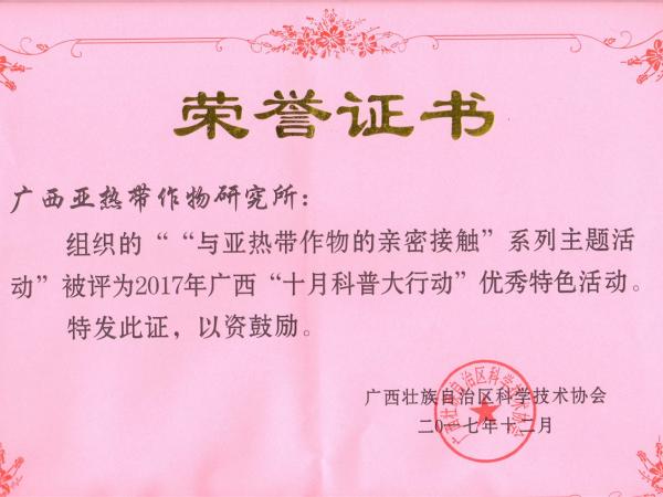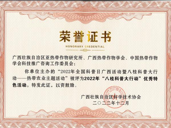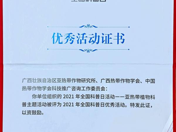 热作所(东盟)亚热带植物园先后承担了广西科技厅重点研发项目、广西自然科学基金项目、广西科技基地和人才专项、广西(农垦)科学研究与技术开发计划项目等50项,选育并国际登录睡莲新品种20个,兰花新品种1个。获得广西科技进步三等奖1项次,广西农科院科技进步三等奖2项次,授权国家专利39件,其中发明专利10件,获得计算机软件著作权12件,发表科技论文57篇。先后被认定为“全国科普教育基地”“全国热带作物科普基地”“广西中小学劳动教育实践基地”“南宁市兴宁区中小学生研学实践教育基地”。多次被中国科协、广西科协授予“优秀组织单位”“优秀特色活动”“广西科技资源科普化优秀案例“等荣誉。