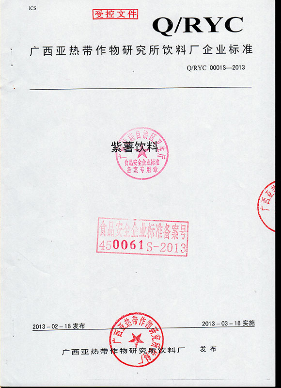 2013年3月初,广西热作所专项资金科技攻关“紫薯汁加工技术研究及产品开发”项目所制定的《紫薯饮料》标准通过了食品安全企业标准备案。该标准规定紫薯饮料的术语和定义、要求、食品添加剂、生产加工过程的卫生要求、试验方法、检验规则、标签、标志、包装、运输、贮存和保质期。该项标准同期规范了总花色苷色素的测定方法。