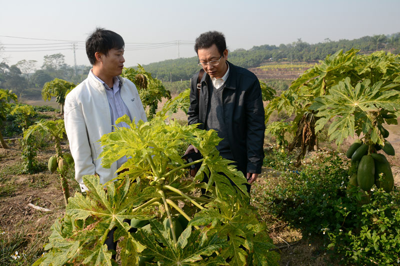广西外国专家局孙永超副处长(右一)观察番木瓜果实