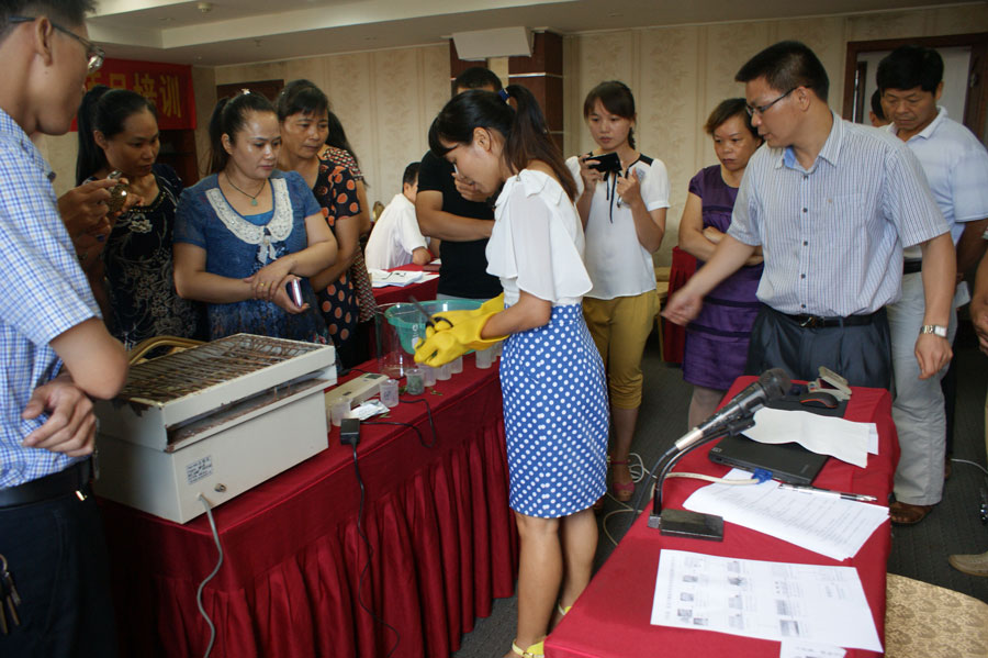 2014年7月14日,应广西农垦茶叶集团公司邀请,广西热作所检测中心科技人员陈永森高级农艺师赴该公司开展现场技术培训。参加培训人员有区农垦局科技产业处及茶叶集团公司的领导,大明山制茶公司、百合制茶公司、先锋制茶公司等分公司的质检员及生产主管。内容包括茶叶产品质量控制、投入品使用、茶叶QS审查通则及出厂检验的相关要求。为了取得更好的培训效果,检测中心把鲜茶叶农药残留快速检测设备带到了会场,对检测操作步骤和检测结果的判定进行了逐步的讲解和演示,对茶叶集团公司提供的鲜茶叶盲样进行了现场检测示范,取得了极好的培训效果。
