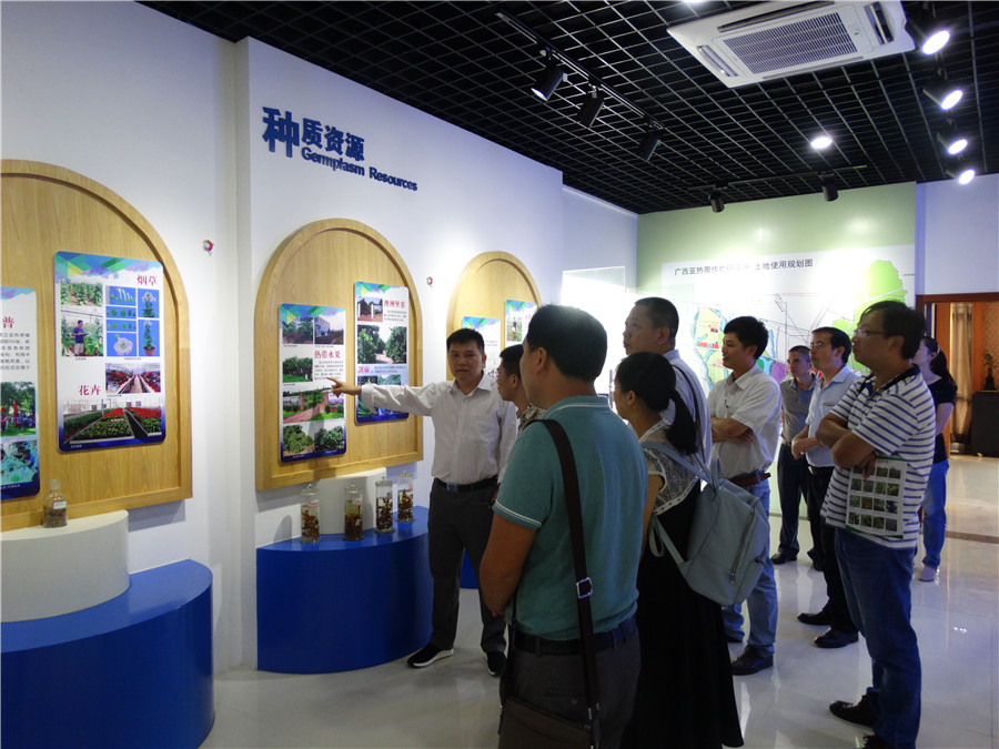郑开斌所长一行在池昭锦副所长的陪同下参观了广西热作所的科技展厅,池昭锦副所长向客人们介绍了广西热作所的历史沿革、发展现状以及未来的发展规划,重点介绍了热作所在种质资源收集与创新利用方面取得的成果,获得了到访宾客的一致称赞。