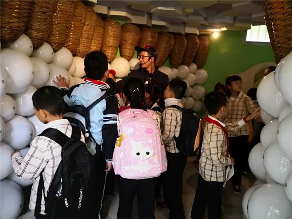 在实践体验活动环节,树人屋自然课堂—通过观察树木年轮结合模型、展板等进行生态环境教育,让学生们认知植物的根、茎、叶、花、果结构,同时并进行显微镜实验观测微小动植物、植物根茎、昆虫结构等,探索自然的奥妙;木薯认知—认知广西特有经济作物木薯,并了解其传播发展,同时品尝木薯糖水,认识不同的食用淀粉,直观感受人类和植物的关系;叶子世界—进入叶子屋模型内部,认识叶子的结构和性状,并以不同植物叶子为素材,动手动脑拼贴作画,开展叶子画竞赛。