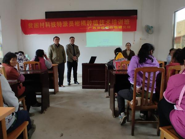 12月22-23日,广西热作所贫困村科技特派员郭丽梅和欧克纬联合广西林科院宋贤冲高级工程师深入藤县北部山区,分别在东荣镇大带村与大黎镇花洲村各举办1期柑橘技术培训班。2期培训班均由广西热作所主办,广西林科院、藤县东荣镇大带村民委员会、藤县大黎镇花洲村民委员会协办。培训邀请了广西特色作物研究院张戈壁担任主讲,郭丽梅等3名特派员陪同授课。2个村的柑橘种植户、兴趣户、贫困户、致富带头人、产业指导员和村干部等共92人次参加了培训。