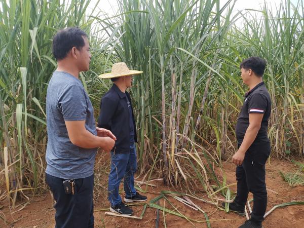在广西晖泽农牧责任有限公司武鸣糖料蔗基地,团队调查热作所自主选育甘蔗品种桂热2号的长势情况,指导基地负责人开展培土等工作。