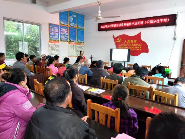9日,科技人员到平福乡社平村举办“种植技术培训班”。共40名油茶种植户、柑橘种植户、村干部等参加培训。培训会上,三名科技人员分别讲授“柑橘冬季管理技术”、“柑橘主要病虫害防治技术”和“香花油茶种植技术”。科技人员通过图文并茂的课件,深入浅出地为村民讲解了相关作物的种植管理技术内容,对种植户提高相关作物栽培管理技术水平有重要的借鉴和指导作用,获得村干和村民的认可与好评。室内培训后,科技人员还到社平村的水果示范园沃柑示范基地与油茶种植示范区的软枝油茶示范基地及香花油茶苗圃基地进行调研,并为各基地提供相关技术指导。