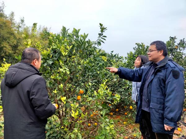 团队成员深入果园实地调查了解沃柑、橙类等柑橘品种在低温气候条件下的落果情况和树势生长情况,与果园种植管理人员深入交流,针对受害情况提出按照“勤施、薄施”原则及时追肥、视情况及早采摘果实、及时喷药防治病虫害等措施,为下一步连续稳产保产提供技术支持。