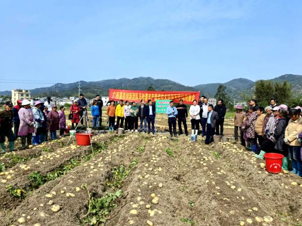 2024年3月20日,广西薯类创新团队栽培与育种岗位功能专家俞奔驰研究员带领团队,在北流市新荣镇扶中村马铃薯示范基地举办丰产栽培技术培训及现场观摩会。国家现代农业产业技术体系广西薯类创新团队各岗位专家、北流市农业农村局、桂北试验站、桂南试验站单位或团队20余人,当地农户80余人参会。