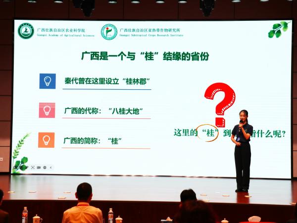 在比赛中,陈致威以“玉米——基因编辑的明星作物”为题,利用玉米作为切入点,让公众科学认识转基因作物;黄云芳以“‘八桂’和肉桂”为题,介绍肉桂与广西渊远深厚的历史情缘。他们风趣幽默、通俗易懂的讲解方式获得阵阵掌声,最终荣获广西科普讲解大赛优秀奖。