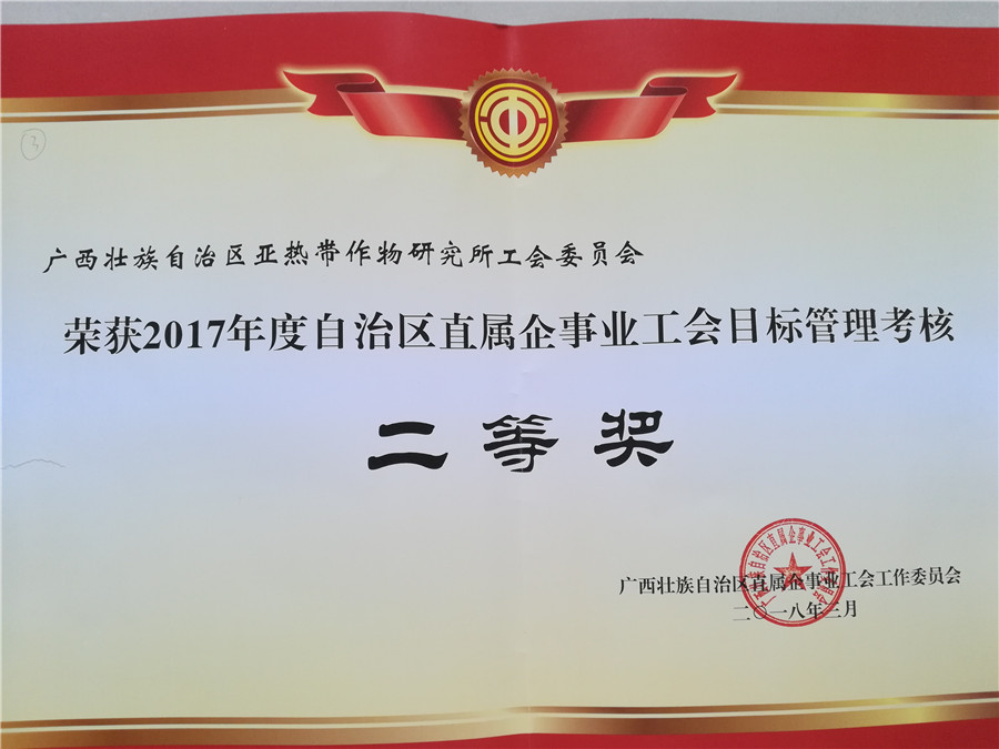 广西热作所工会荣获2017年度自治区直属企事业工会目标管理考核二等奖