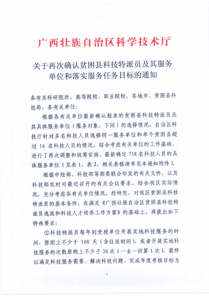 关于再次确认贫困县科技特派员及其服务单位并落实服务目标任务的通知