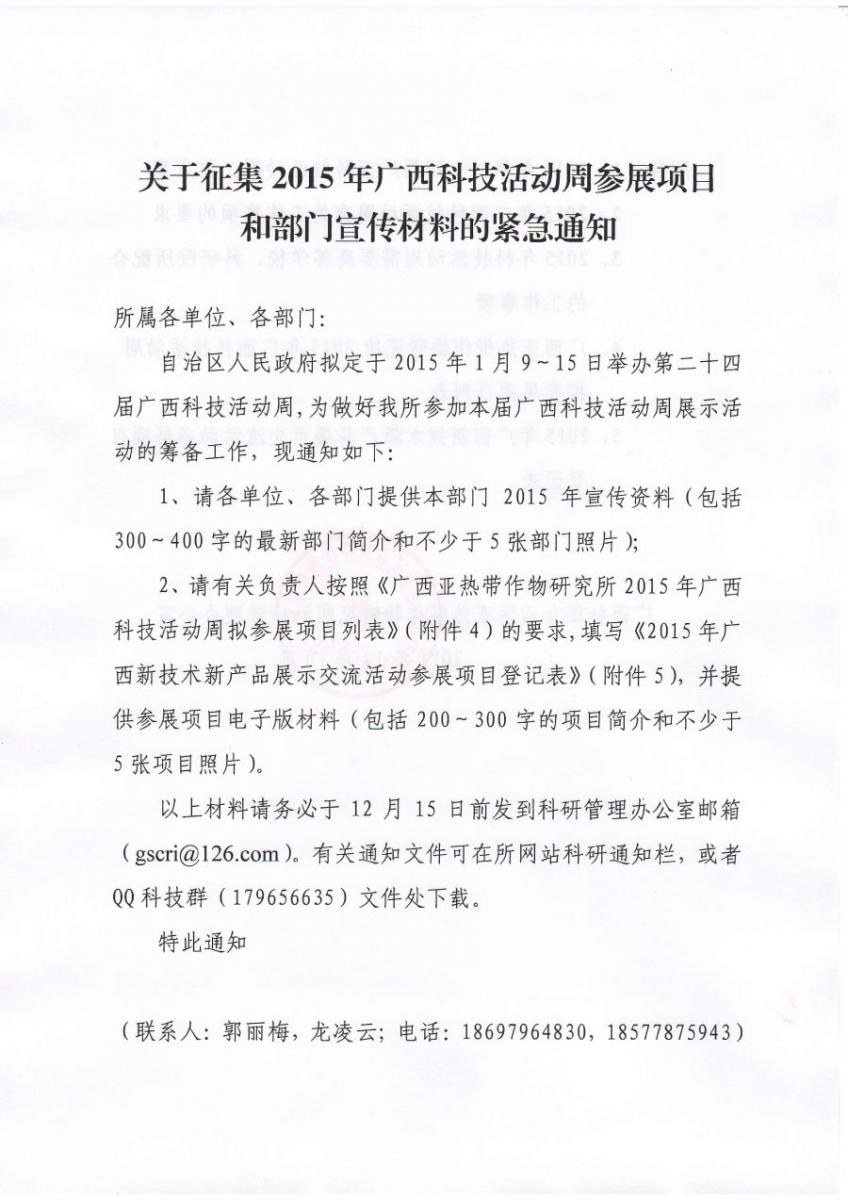 关于征集2015年广西科技活动周参展项目和部门宣传材料的紧急通知