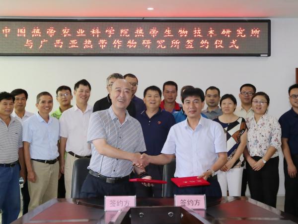 2020年8月13日,中国热科院生物所与广西热作所合作框架协议签约仪式在南宁举行。热科院生物所所长方骥贤与广西热作所所长黄强分别代表双方签约,广西热作所党委书记池昭锦,副所长庞新华、梁声侃、李军,热科院生物所副所长蒲金基及相关人员出席。
