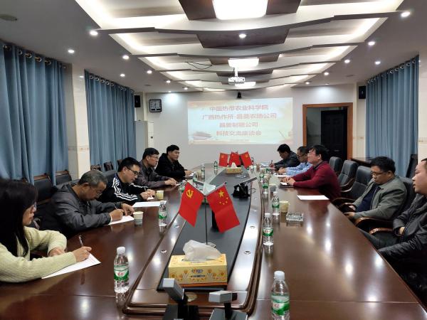 座谈会上,昌菱公司董事长黄富宇等领导专家热情介绍了该场的概况,以及与中国热科院、广西热作所的合作情况。易克贤高度赞扬该场取得的成绩,随后,介绍了热科院环植所研究方向及取得的成果,并就甘蔗病虫害防控、林下经济等方面提出合作设想。庞新华对昌菱公司长期以来的支持表示感谢,并就广西农垦甘蔗一级良种繁育基地的合作提出建议。