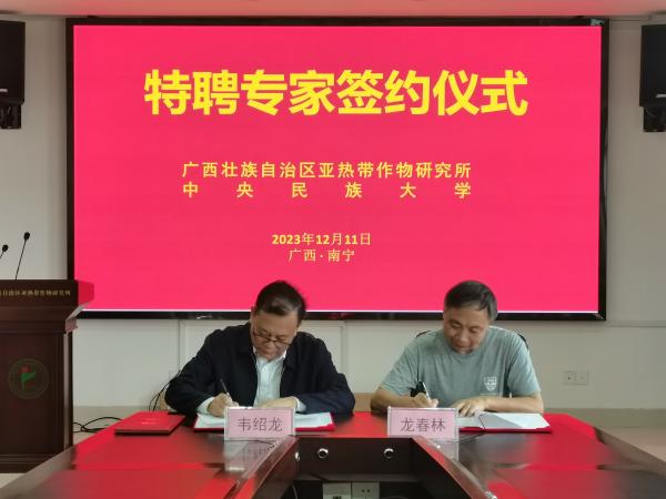 在广西热作所特聘专家签约仪式上,龙春林教授被聘为特聘专家。签约仪式结束后,韦绍龙与龙春林就未来的合作进行深入的探讨,并达成了一致意见,双方将共同致力于科技创新和人才培养,为单位的可持续发展做出更大的贡献。