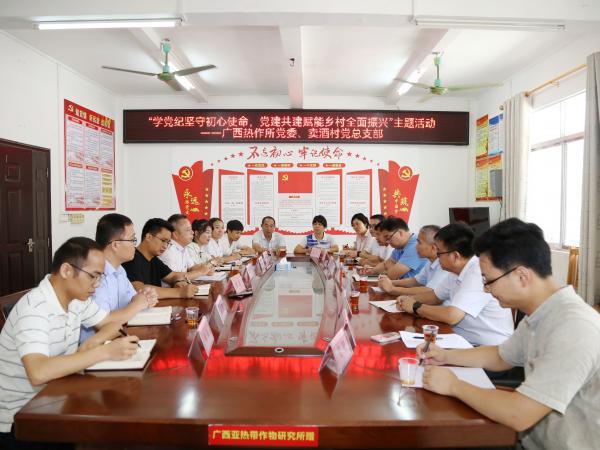 6月20日,广西热作所党委副书记、所长陈赶林,党委副书记梁声侃,副所长李军、覃剑峰及其他党委委员到兴业县卖酒镇卖酒村开展“学党纪坚守初心使命,党建共建赋能乡村全面振兴”主题活动,并对广西热作所在卖酒村开展驻村工作的周时艺同志进行慰问。