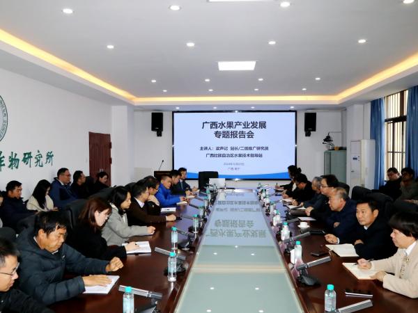 12月20日,广西壮族自治区水果技术指导站站长、二级推广研究员梁声记受邀到广西热作所作“广西水果产业发展”专题报告。所党委副书记、所长陈赶林,党委副书记梁声侃,副所长李军、覃剑峰、冯春梅出席活动,陈赶林主持活动,相关科技人员50余人参与交流。