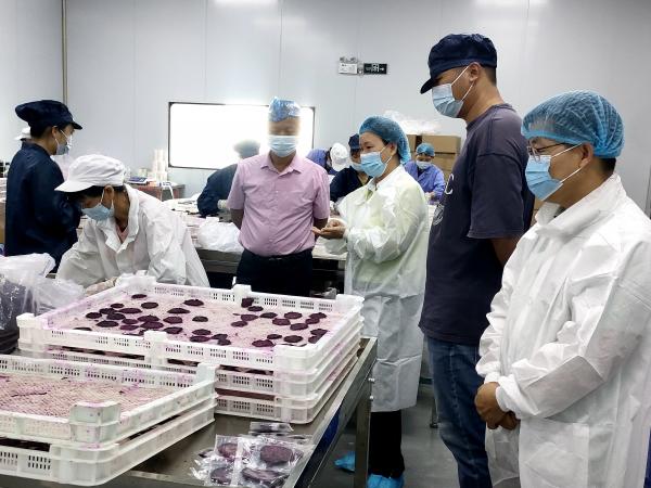 科技人员参观了广东麦果匠食品有限公司火龙果干生产线,与公司负责人进行交流与探讨,针对火龙果产品黏连、变形、包装切片等问题,广西热作所科技人员结合自身研究成果与行业实践经验,提出了针对性技术改进建议:一是果片间隔摆放以达到防止产品黏连,提升产品品相;二是适当调整温度与湿度,防止果片快速收缩导致的形状变形问题,保障产品外观完整性;三是通过调整包装机速率与果片间距达到避免切片,减少机械损伤的损耗。此外,双方还就芒果干、菠萝果干等热带果干的加工工艺升级、产品创新等方面进行了广泛探讨。
