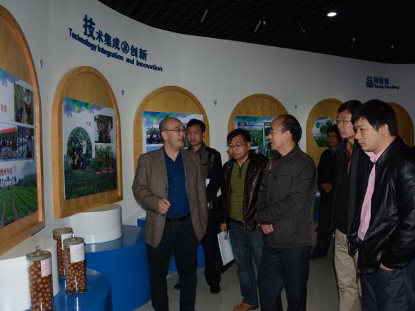 黄强在热作所科研新区2号楼新建的科技展厅向黄仕训一行介绍了热作所在木薯、澳洲坚果、芒果、剑麻、甘蔗、茶叶、花卉、柑桔等作物种质资源收集保存、栽培、加工技术等方面的研究以及取得的成果。