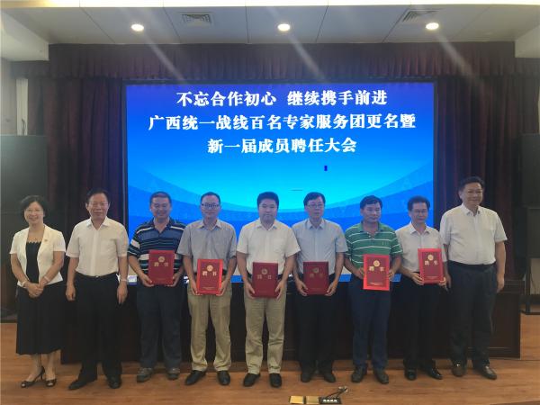 2019年8月30日下午,自治区党委统战部召开广西统一战线百名专家服务团新一届成员大会,自治区党委常委、统战部长徐绍川出席并讲话,为广西统一战线百名专家服务团授旗,为成员颁发聘书。广西热作所副所长李军、广西木薯所副所长田益农入选广西统一战线百名专家服务团并参加新一届成员聘任大会。李军任广西统一战线百名专家服务团农林渔牧分团副分团长,并作为代表上台接受聘书。