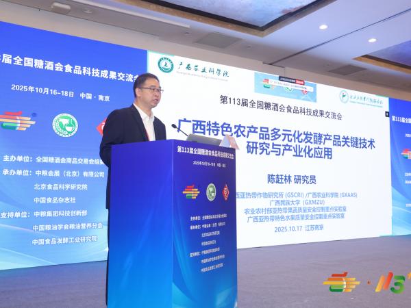 2025年10月16-17日,由北京食品科学研究院、中国食品杂志社和中粮(会展)有限公司联合主办的“第113届全国糖酒会食品科技成果交流会”在南京顺利召开。中国工程院环境与轻纺工程学部副主任陈坚院士等23位专家学者在会上做了精彩学术报告。广西热作所党委副书记、所长陈赶林应邀主持分场报告会并作学术报告。此次活动汇聚了全国顶尖科研院所、高校与企业,搭建起产学研深度融合的桥梁,推动食品科技走向产业前沿。