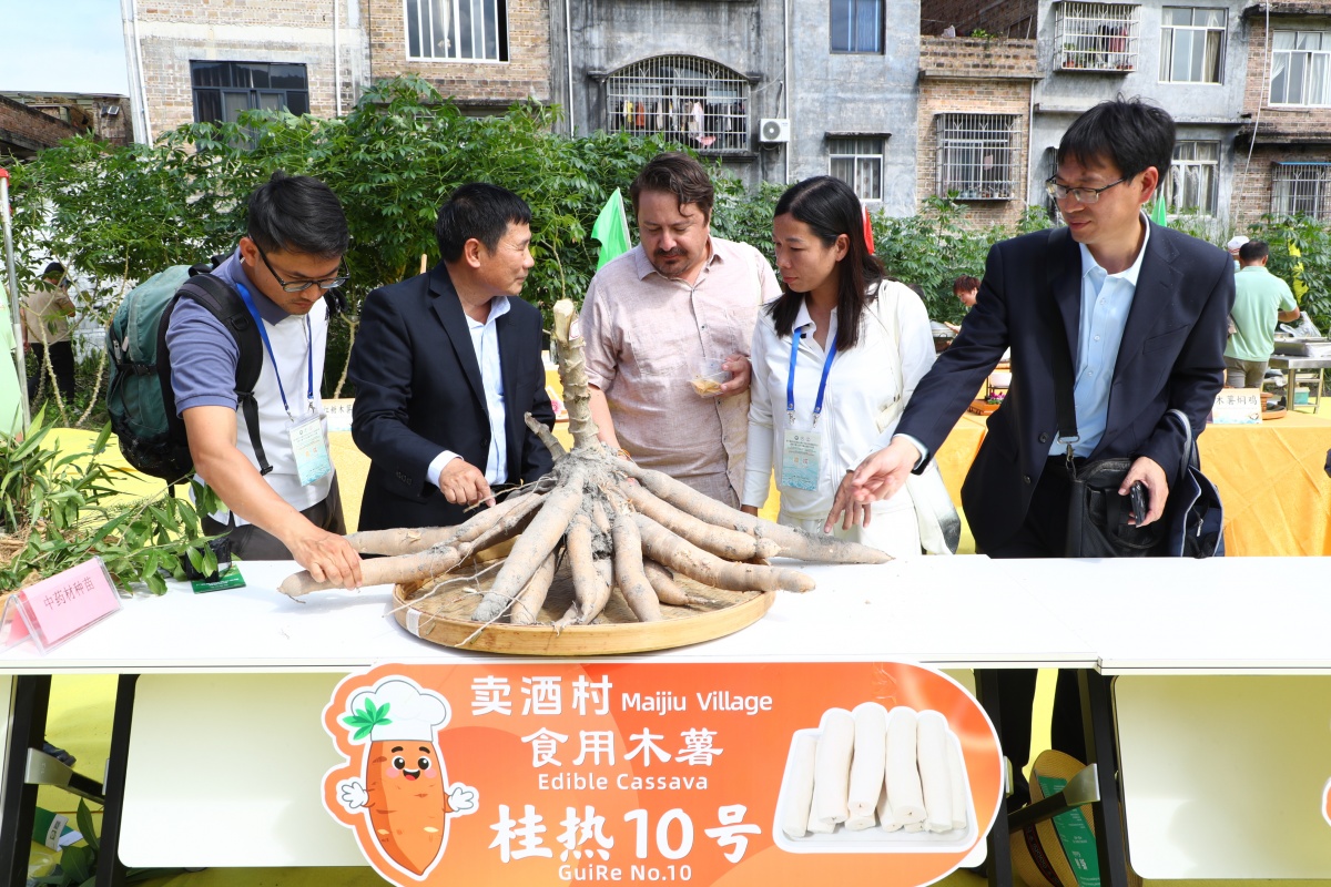 在产业实践分享环节,与会者走进兴业县,参与农民丰收节活动,现场观摩广西壮族自治区亚热带作物研究所选育的桂热10号、桂热13号等优质木薯品种,品尝木薯羹、木薯脆片、香葱炒木薯等创新制品。