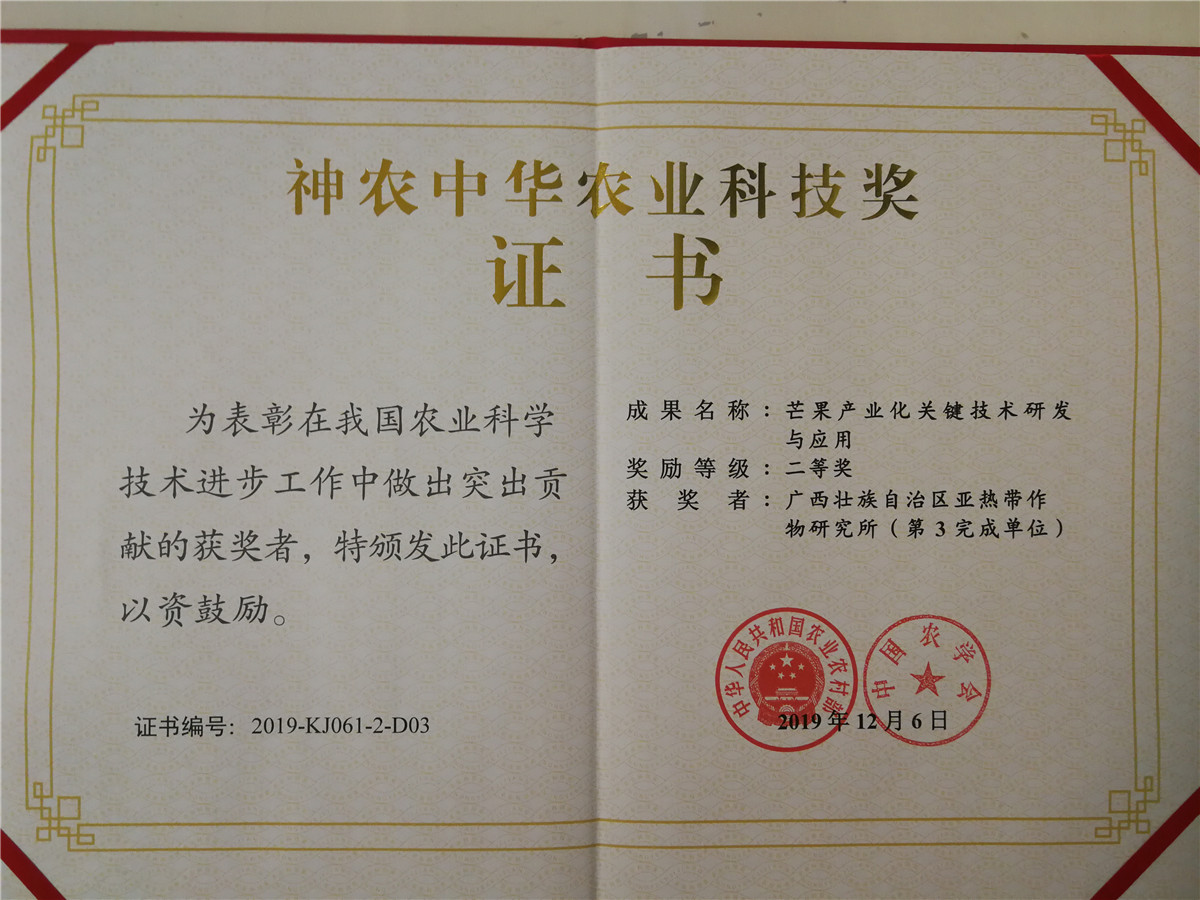 2019 | 芒果产业化关键技术研发与应用 | 神农中华农业科技奖二等奖 | 中国热带农业科学院热带作物品种资源研究所,中国热带农业科学院环境与植物保护研究所,广西壮族自治区亚热带作物研究所,攀枝花市农林科学研究院,海南省农业科学院热带果树研究所,海南大学热带作物学院,云南省农业科学院热带亚热带经济作物研究所 | 陈业渊,党志国,张贺,符悦冠,黄建峰,华敏,贺军虎,林电,高爱平,蒲金基,黄国弟,陈于福,李贵利,余东,龚德勇 |