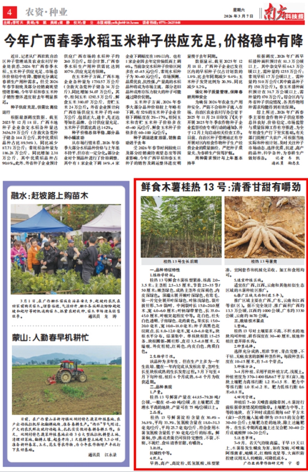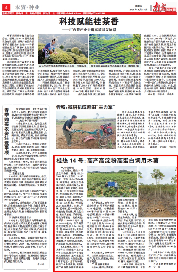 本报讯(记者 邹江 实习生 李采华 李武昌)7月23日,在兴业县卖酒镇赵村百亩“水果木薯”种植基地,来自广西亚热带作物研究所(简称热作所)的技术人员正在指导农户作好湿热天气的虫害防治。近日,该研...[2026-03-11]