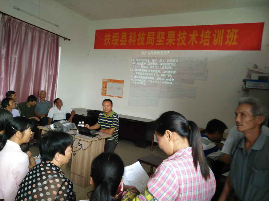 2016年5月18日,应扶绥县科技局邀请,广西热作所曾黎明高级农艺师赴扶绥县龙头乡林旺村,举办澳洲坚果种植技术培训讲座,参加培训人员有林旺村及周边澳洲坚果种植户共97人。