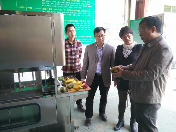 随后,热作所科技人员到达华南理工大学国家大学科技园入园企业广州大桥食品设备有限公司调研。公司董事长杨李益结合设备加工视频就其公司设备给做了详细的介绍,其公司生产的自适应球形果蔬削皮机具有高效、卫生、加工损失率低等优点。科技人员进行了芒果和火龙果现场加工测试,观看学习了削皮机和切片机的操作流程和切割工艺。