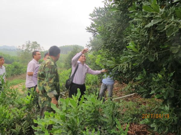 4月19日上午,在崇左市水果办副主任陆宜称的陪同下,广西热作所科技人员参观了崇左市江州区江州镇钟色昌种植户的澳洲坚果园,并就澳洲坚果的品种适应性、育苗和栽培管理等问题与其进行了交流。下午,在龙州县农业局坚果办副主任梁政福的陪同下,广西热作所科技人员参观了龙州县武德乡武德村逐安屯的澳洲坚果新品种引进试验区,双方就澳洲坚果的品种适应性、栽培管理和种植推广等问题进行了探讨。