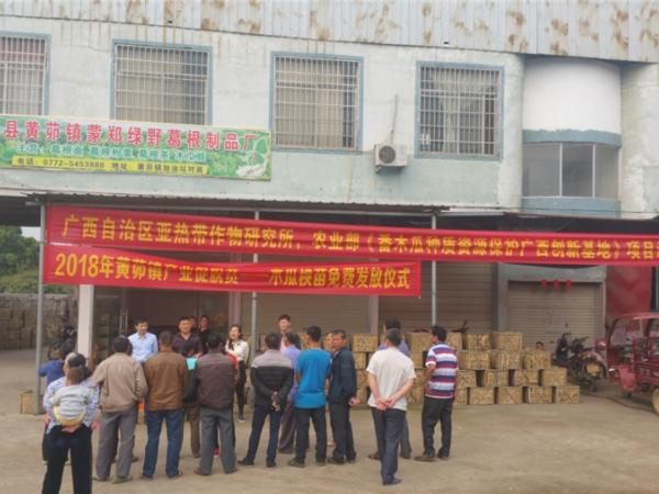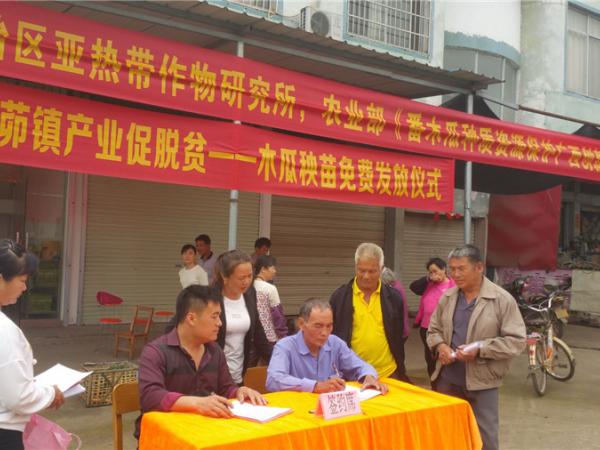 2018年3月18日-19日,广西热作所科研管理办公室主任庞新华带领农业部《番木瓜种质资源保护广西创新基地》技术团队成员参加来宾市武宣县黄茆镇2018年产业促脱贫—番木瓜秧苗免费发放仪式。黄茆镇党委书记梁璐,镇党委副书记、镇长韦绍斗,镇党委委员、副镇长何念及受赠贫困户参加了本次发放仪式。