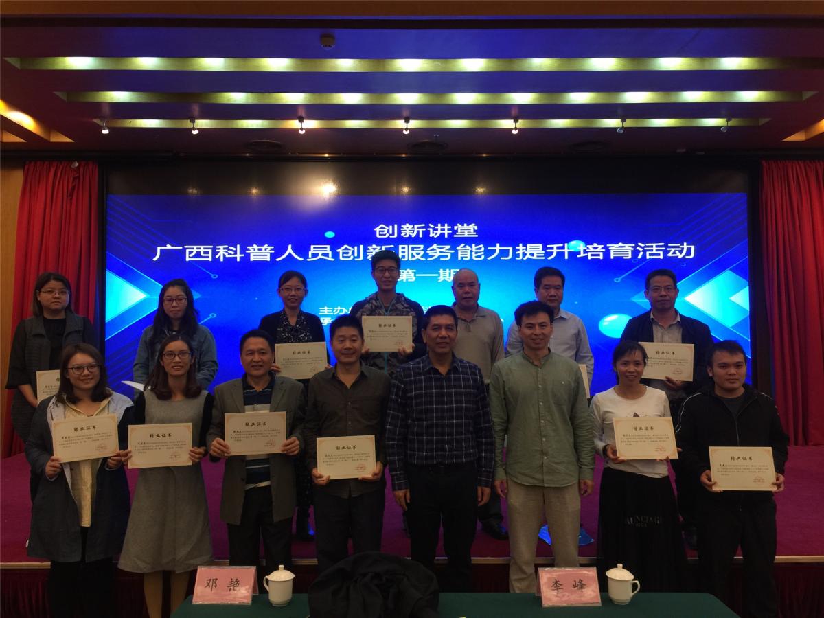2018年10月16-17日,由广西壮族自治区科学技术厅主办,广西科学活动中心承办的“创新讲堂-广西科普人员创新服务能力提升培育活动”在南宁市举办,广西热作所派员参加了本次培训。