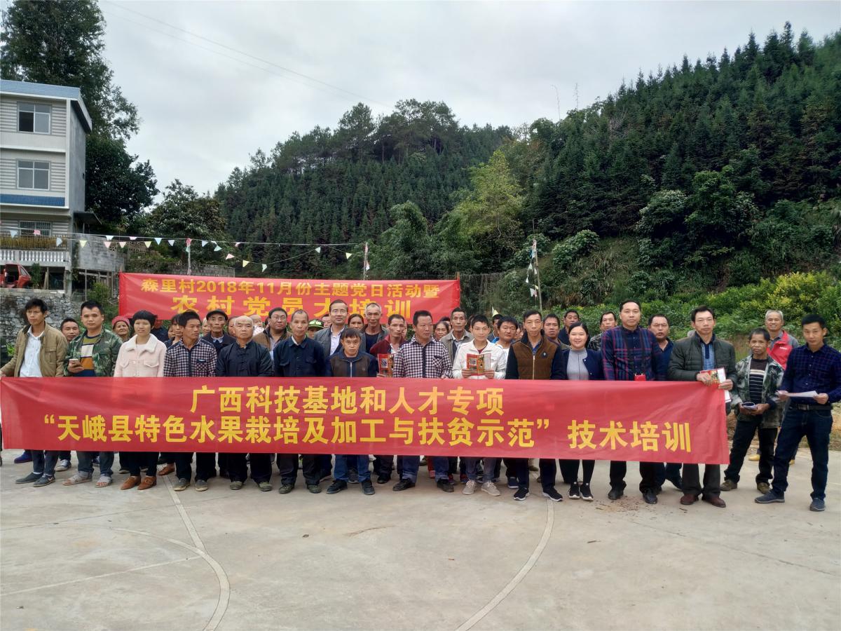2018年11月9日,由广西热作所、天峨县无公害水果专业合作社承担实施的广西科技基地和人才专项“天峨县特色水果高效栽培及加工利用与多产业融合发展精准扶贫示范”项目技术培训会在天峨县岜暮乡森里村举行。