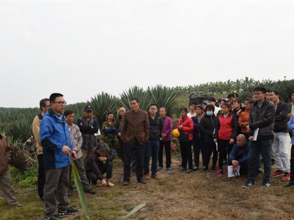 2019年1月25日,针对广西农垦国有东方农场剑麻新菠萝灰粉蚧为害及紫色卷叶病偶发的情况,国家麻类产业体系南宁剑麻综合试验站联合国家麻类产业技术体系剑麻生理与栽培岗位专家团队,到该场进行现场培训。培训内容涵盖了剑麻主要病虫害的识别与防控,特别是对剑麻新菠萝灰粉蚧和紫色卷叶病的防控方面。团队现场发放剑麻病虫害防控知识资料150余份。农场管理干部、种植户以及国家麻类产业技术体系一岗一站团队成员共计160多人参加了培训。专家们现场教学,指导种植户识别虫、病,并指导种植户进行药物防控。