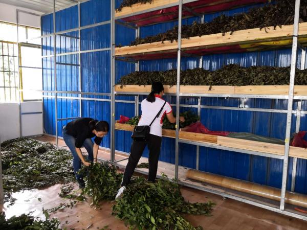团队成员在融安县板榄镇东岭村车田茶叶专业合作社的虫茶生产车间中进行相关指标监测,采集不同虫态的产茶昆虫进行后续室内饲养试验,开展不同原料配比的虫茶加工实验,并针对加工关键环节向生产企业负责人提出建议。