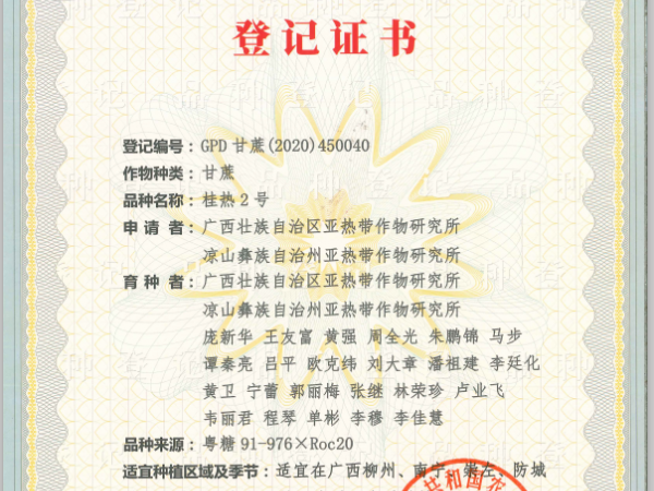 由广西热作所选育的甘蔗新品种“桂热2号”于2020年9月2日获得了农业农村部颁发的非主要农作物品种登记证书,这是广西热作所首次获得甘蔗品种登记证书。
