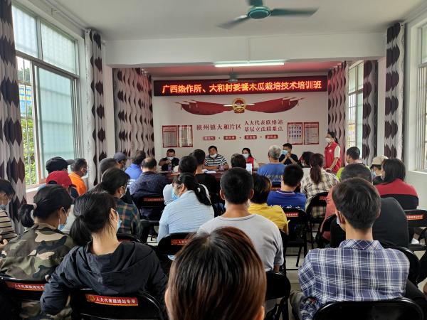 2022年5月25日,广西热作所乡村科技特派员欧景莉、潘祖建、陈燕一行3人应横州市横州镇大和村委的邀请,赴大和村举办番木瓜高产栽培及病虫害防治技术培训班。