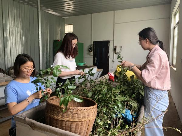 在融安县板榄镇东岭村车田茶叶专业合作社,团队成员向企业相关负责人了解当地春茶寒冻害受灾情况及产销情况,在负责人的陪同下前往生产车间实地查看虫茶产茶昆虫引化情况,并采集虫源及不同寄食原料,用于继续完善寄主植物和产茶昆虫特性等相关研究,并针对茶叶合作社新厂房基地选址、2022下半年虫茶实验开展及新产品的研发等内容与负责人进行深入交流。