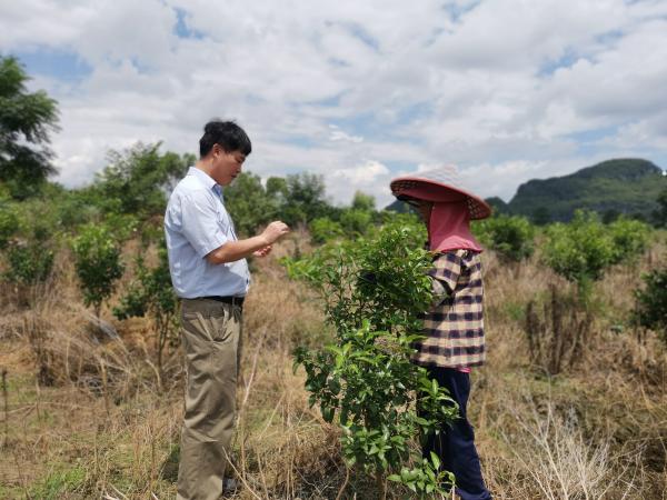 今年5月,广西热作所特色水果先锋队科技人员到该沃柑种植园调查病虫害情况,发现橘溃疡病大面积发生。先锋队当即为基地负责人提供增强抗病力,幼果保护、害虫防治、化学药剂使用等建议。