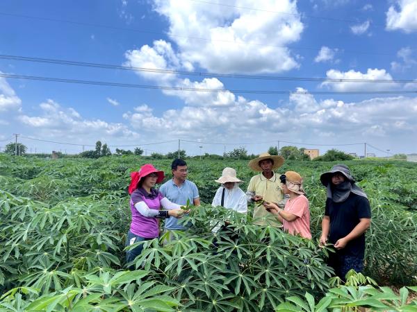 在石龙镇福平村,团队成员深入木薯地调查和诊断木薯病虫害发生情况,现场指导木薯种植户识别木薯病虫害并讲解其发生规律,并向他们赠送一批肥料、农药等农资。