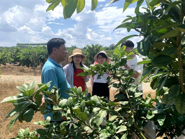 覃茜一行深入府城镇四明村阳光玫瑰、红宝石青柚种植基地,永共村释迦果种植基地,太平镇庆乐村沃柑、龙眼、火龙果种植基地,进行实地参观调查,了解基地生产经营、规范管理、科技创新、渠道销售等方面的情况,指导基地负责人适时开展施肥、病虫害防治、科学除草等日常工作。