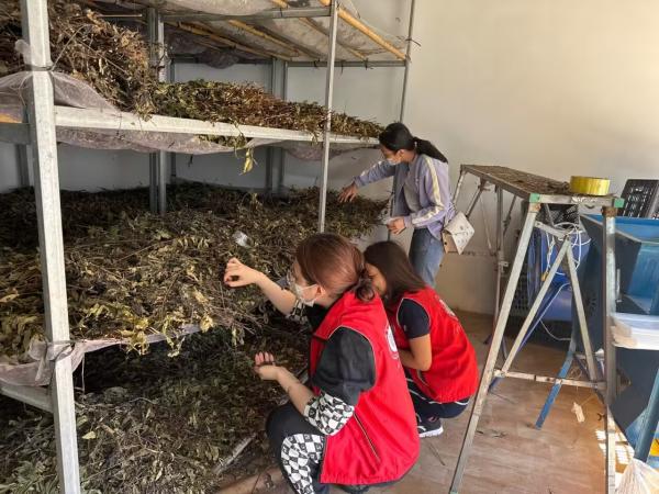 在融安县板榄镇东岭村车田茶叶专业合作社,广西热作所科技人员就虫茶产茶昆虫越冬环境温湿度控制、虫茶加工车间的升级改造等方面与合作社负责人进行交流并提出专业指导意见。交流结束后,广西热作所加工中心党支部还赠送了合作社一批农用物资。