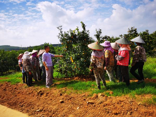 近几年,明阳农场在完善病虫害绿色防控设施和提升农业机械化方面下足功夫,力争打造好广西农垦向阳红沃柑产业示范园。团队查看沃柑基地农资投入品、农药使用记录,了解当地农户的农药习惯等情况,针对性存在的问题开展沃柑全程质量安全生产控制技术培训。 团队从沃柑全程质量控制的理论、生产主体及过程控制技术措施实施、相关的法律法规等方面做了详细讲解。此外,还与沃柑种植户分享交流种植心得、经验,并对种植户提出的农药使用技术问题进行解答。