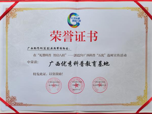 2023年1月16日,广西热作所参加在广西科技馆举办的“礼赞科普 智启八桂”——2022年广西科普“五优”选树宣传活动发布盛典,本次宣传活动共评选产生优秀科学传播活动10项、优秀科普教育基地10个、优秀科学传播栏目(新媒体)10个、优秀科学传播人物10名、科技资源科普化优秀案例5个。