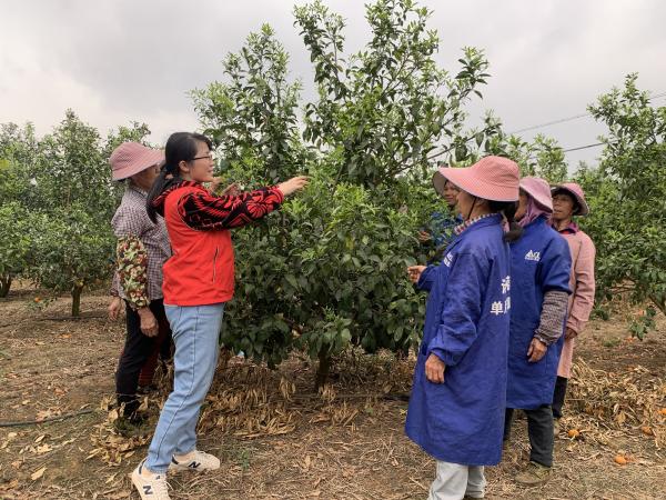 覃茜首先到武鸣区太平镇庆乐村沃柑种植示范基地对种植户开展“沃柑春季种植技术”培训,培训围绕沃柑采后养护,春季修剪及病虫害防治等内容开展,并发放相关资料份。此外,科技特派员指导农户安装和应用广西热作所自主研发的“柑橘病虫害防治系统”,该系统可用于查询柑橘有关病虫害防治措施,也可转链接至广西农村科技服务云平台咨询相关专家。