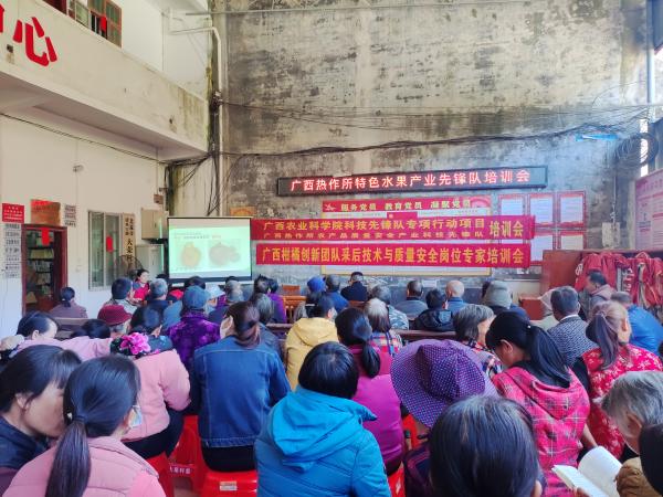 培训会邀请广西热作所农产品质量安全产业科技先锋队、特色水果产业科技先锋队队员,西埌镇农业技术推广站站长,北流市经贸科技局工作人员讲授柑橘采后保鲜、常见病虫害防治技术,黄龙病危害及防控,农产品质量安全知识,百香果病害与防控,火龙果病虫害防治,荔枝黑皮病等内容。因培训内容丰富,与实际生产需求贴近,培训现场人数达到了原计划的160%,座无虚席,培训效果良好。室内授课结束后,授课教师到沃柑种植园现场指导参训人员开展保果工作。