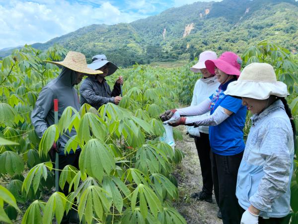 目前木薯茎叶和块根正处于生长旺盛期,团队一行指导农户及时施用壮薯肥,保证木薯块根膨大期间补充养分,促进木薯块根膨大,提高木薯产量;针对近期当地持续高温少雨,木薯红蜘蛛暴发危害上升,团队一行提出监测虫害及防控措施,指导农户加强对病虫害的监测与防治。