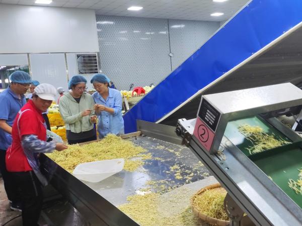作为番木瓜酱菜原料的番木瓜干丝如含水量控制不规范,可导致易断裂、易褐变、复水率不稳定等问题,对此,团队成员在考察了企业番木瓜干丝及酱菜生产现场后,提出了提高链式烘干机传送速率,控制待烘木瓜条堆叠厚度、干丝含水量终点,降低干丝断条率;调节冷库温度,防止干丝贮藏期间褐变等建议。针对企业电商畅销产品不浸糖红薯干存在的微波灭菌口感发硬、巴氏杀菌易出现灭菌不彻底等消费者集中反映的问题,团队成员建议通过蒸煮来增加产品柔软度,采用真空独立袋装配合巴氏杀菌延长产品保质期,增加消费者食用便利性。