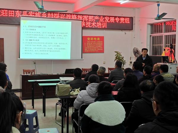 应田东县实施乡村振兴战略指挥部产业发展专责组邀请,3月6日,广西热作所芒果栽培及病虫害综合防控技术研究团队负责人陈永森研究员一行2人前往百色市田东县林逢镇公靖村开展芒果春季管理技术培训,村委干部及村民共60余人参加培训。